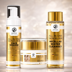 Indulge in the luxurious blend of Ojiugo All In One Luxury Cosmetics' Micellar Water Cleanser, Elixir Face Mousse, and Elixir Face Cream, a harmonious trio that transforms your skincare routine into a pampering experience, leaving your skin radiant, revitalized, and glowing with health and vitality