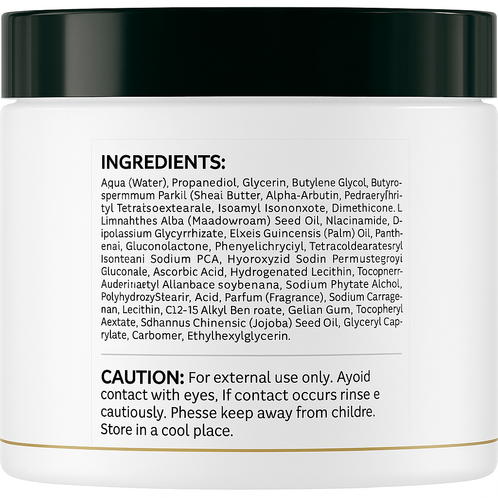 Aqua (Water), Propanediol, Glycerin, Butylene Glycol, Butyrospermum Parkii (Shea) Butter, Alpha Arbutin, Pentaerythrityl Tetraisostearate, Isononyl Isononanoate, Dimethicone, Limnanthes Alba (Meadowfoam) Seed Oil, Pentylene Glycol, Glutathione, Pentaerythrityl Distearate, Myristyl Lactate, Vitamin C, Hydroxyethyl, Acryloyldimethy Taurate, Tranexamic acid, AetearylAlcohol, Glyceryl Behenate, Mica, Carbomer, Hibiscus Sabdariffa Seed Oil, Polysorbate 60, Sorbitan Isostearate, Disodium Edta, Sodium Hydroxide, Vaccinium Myrtillus (Bilberry Seed Oil) Amodimethicone, Tocopherol, Citric Acid, Benzyl Salicylate, Citronellol, Coumarin
