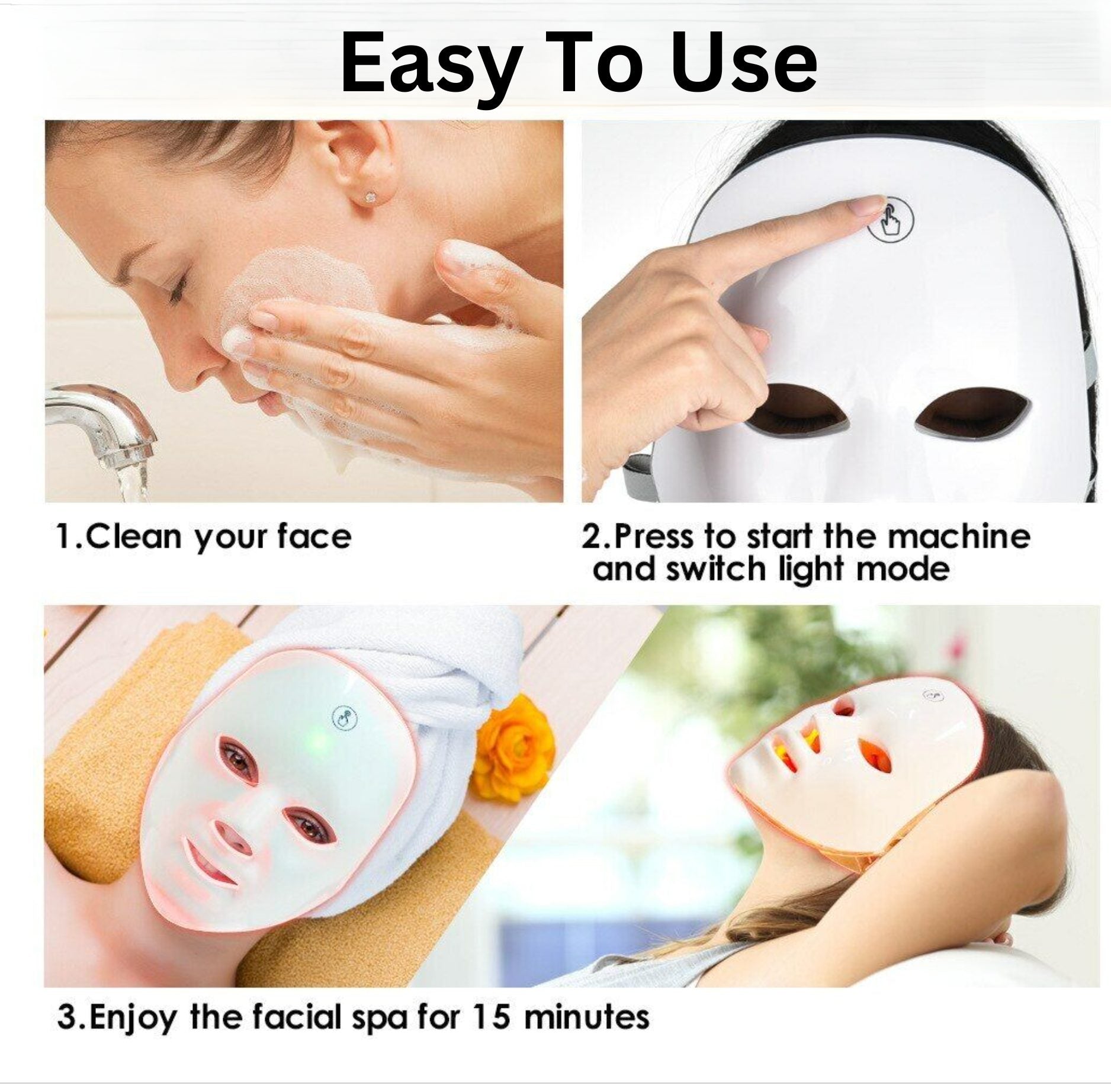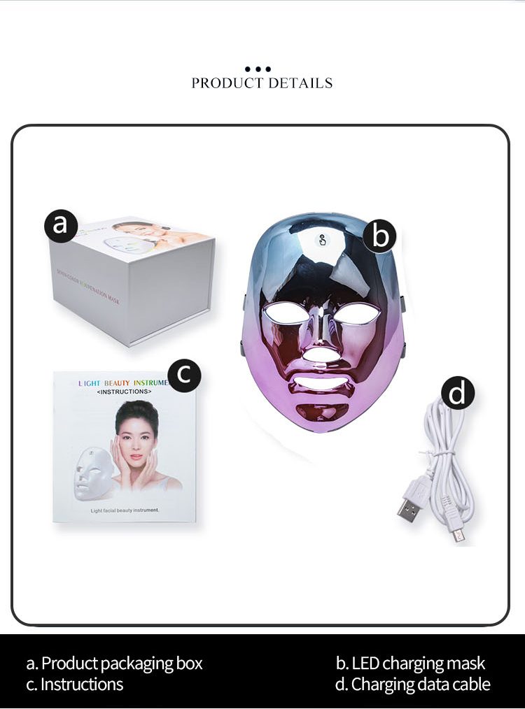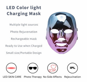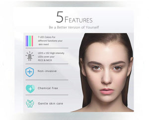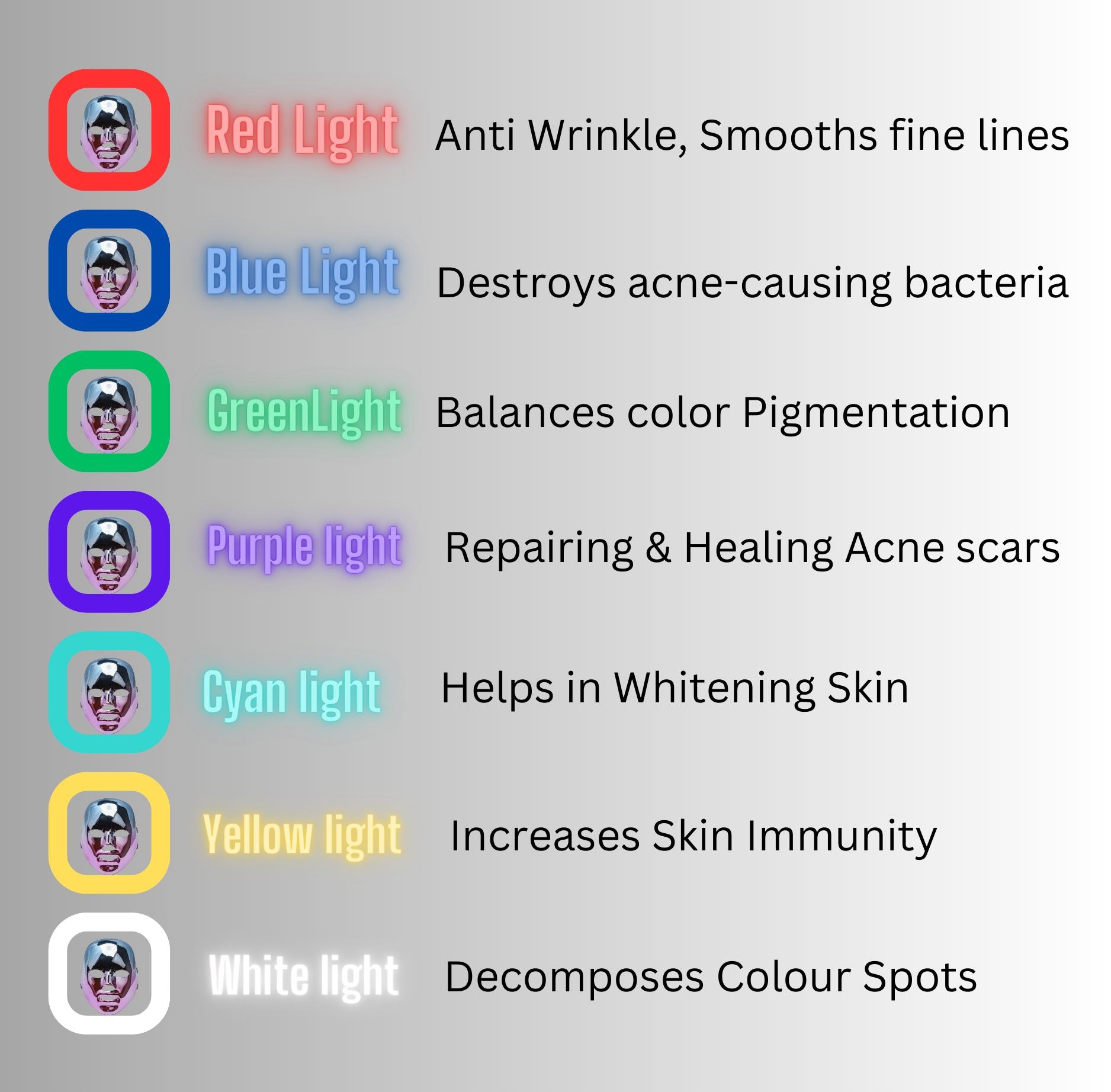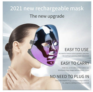 Introducing our cordless Face Mask, harnessing the power of seven different colors to penetrate pores and enhance cell metabolism effectively. This mask deeply penetrates to combat aging, wrinkles, improve blood circulation, boost collagen production, refine skin texture, diminish melanin and red spots, enhance skin elasticity, brighten the complexion, promote whitening, and boost moisture absorption. Each wavelength targets specific skin concerns, offering a comprehensive solution for various skin issues.- 7 Colors LED Light Photon Therapy.