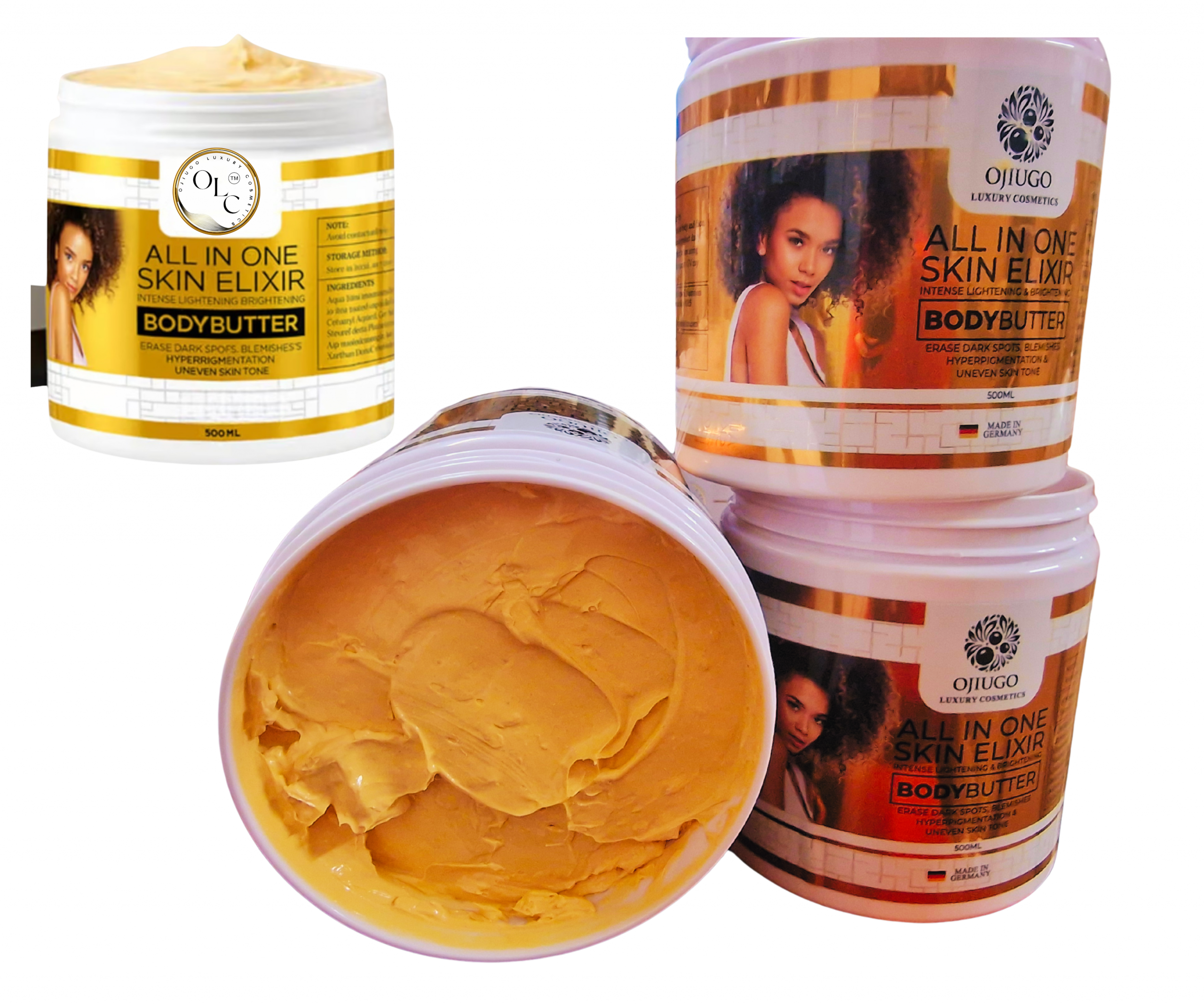 “Illuminate Your Skin: All-In-One Elixir Body Butter – Your Path to Radiant Beauty” Introducing our extraordinary All-In-One Elixir Body Butter, meticulously crafted to target hyperpigmentation, age spots, blemishes, and uneven skin tone. Our specialized formulation is designed to help you regain radiance and achieve a beautifully balanced complexion. Here are the remarkable benefits of our All-In-One Elixir Body Butter: Targets hyperpigmentation, age spots, and blemishes Evens out skin tone for a radiant complexion Brightens and lightens dark spots Nourishes and moisturizes deeply Provides antioxidant protection for healthier skin Delivers a luxurious and indulgent skincare experience Immerse yourself in the transformative power of our All-In-One Elixir Body Butter, where each application brings you closer to luminous and flawless skin. Say goodbye to skin imperfections and hello to a renewed, glowing complexion. Elevate your skincare routine with our premium body butter and embark on a journey towards a more radiant and beautiful you. Experience the radiance and confidence that come with a revitalized complexion and let your beauty shine with our All-In-One Elixir Body Butter