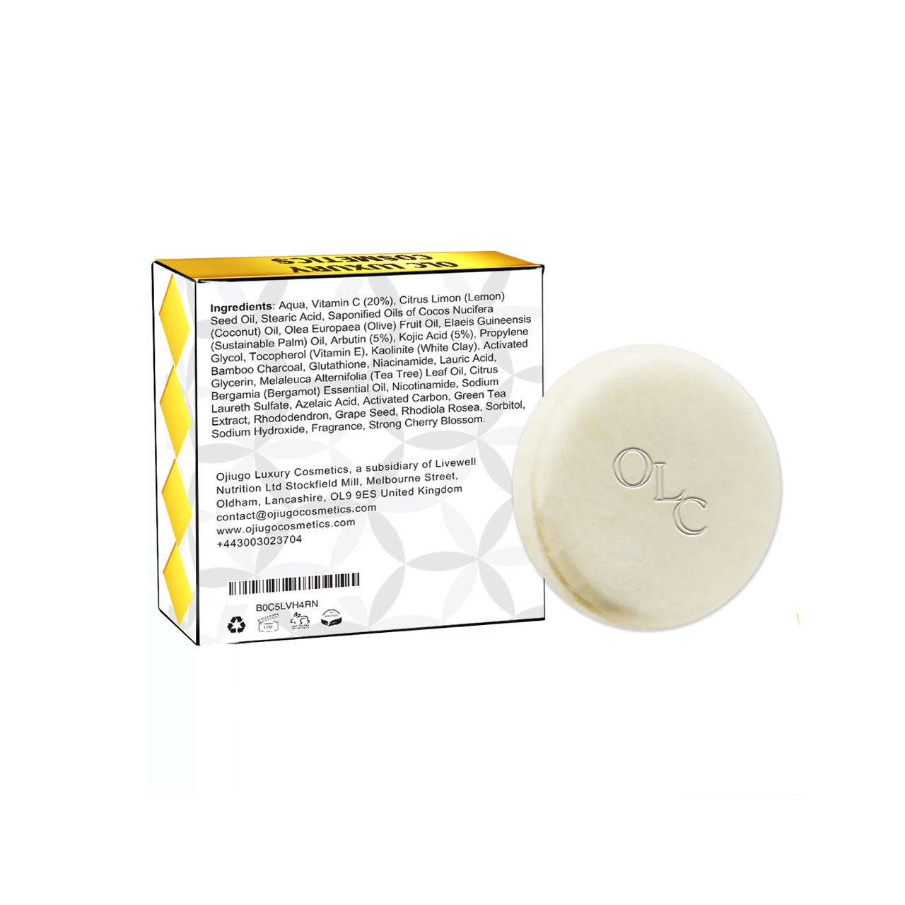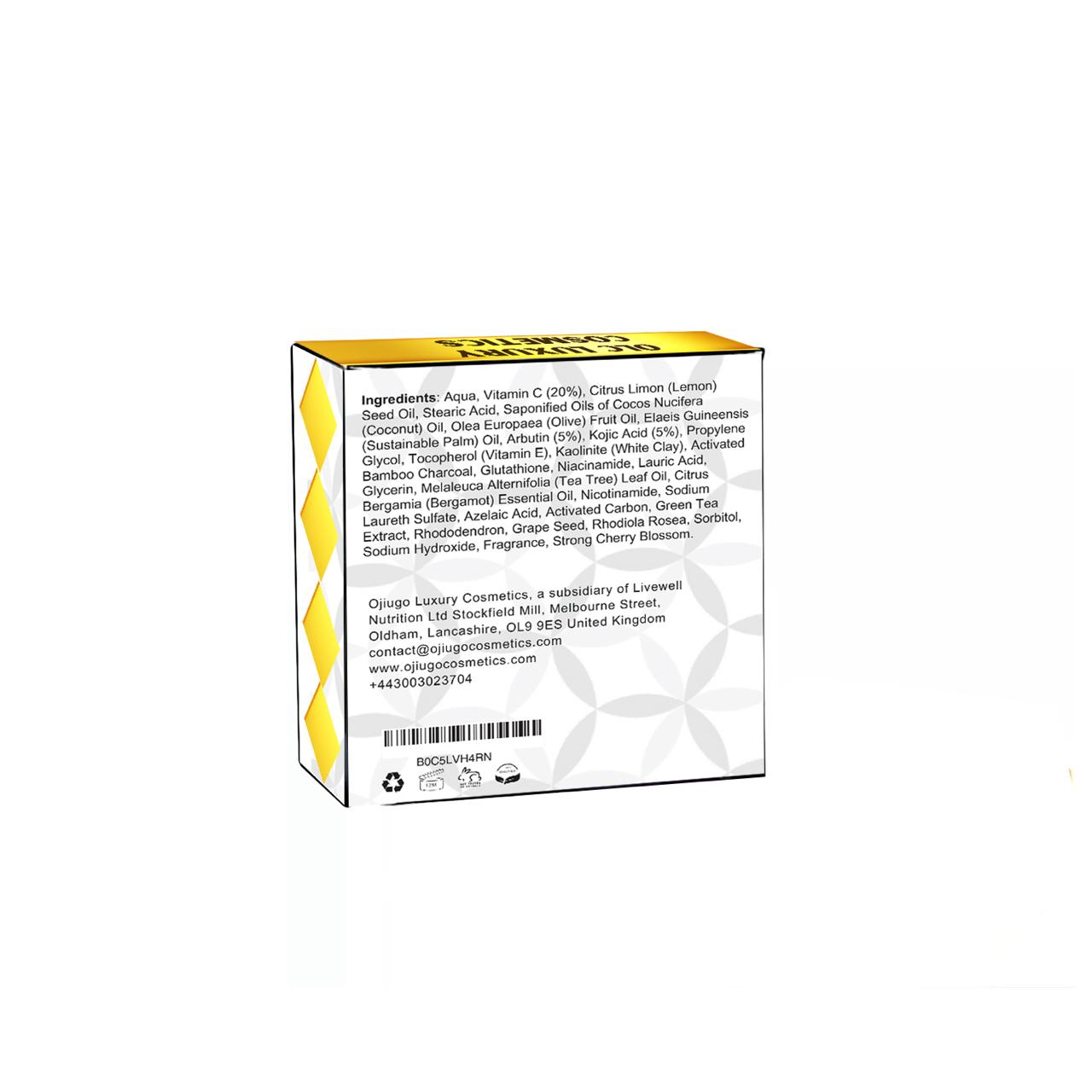 Aqua, Vitamin C (20%), Citrus Limon (Lemon) Seed Oil, Stearic Acid, Saponified Oils of Cocos Nucifera (Coconut) Oil, Olea Europaea (Olive) Fruit Oil, Elaeis Guineensis (Sustainable Palm) Oil, Arbutin (5%), Kojic Acid (5%), Propylene Glycol, Tocopherol (Vitamin E), Kaolinite (White Clay), Activated Bamboo Charcoal, Glutathione, Niacinamide, Lauric Acid, Glycerin, Melaleuca Alternifolia (Tea Tree) Leaf Oil, Citrus Bergamia (Bergamot) Essential Oil, Nicotinamide, Sodium Laureth Sulfate, Azelaic Acid, Activated Carbon, Green Tea Extract, Rhododendron, Grape Seed, Rhodiola Rosea, Sorbitol, Sodium Hydroxide, Fragrance, Strong Cherry Blossom.