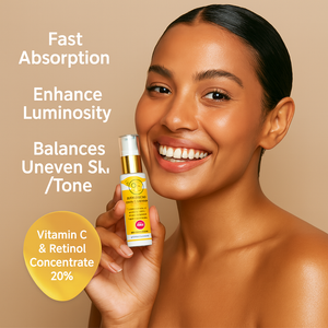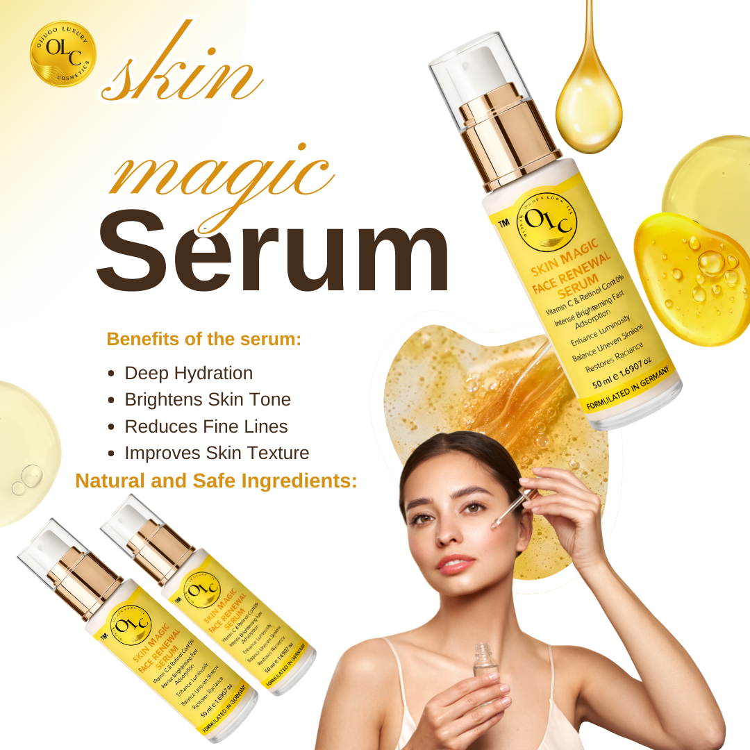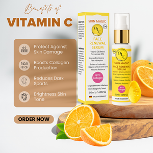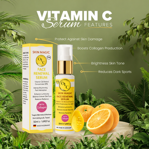Introducing our Skin Magic Face Renewal Serum, a powerhouse formulation that combines intense brightening and collagen-boosting properties for a radiant complexion. This luxurious serum is enriched with 20% Vitamin C and Retinol, delivering fast absorption to provide exceptional results. Each carefully selected ingredient works in harmony to fade dark spots, improve skin texture, and promote a youthful glow.