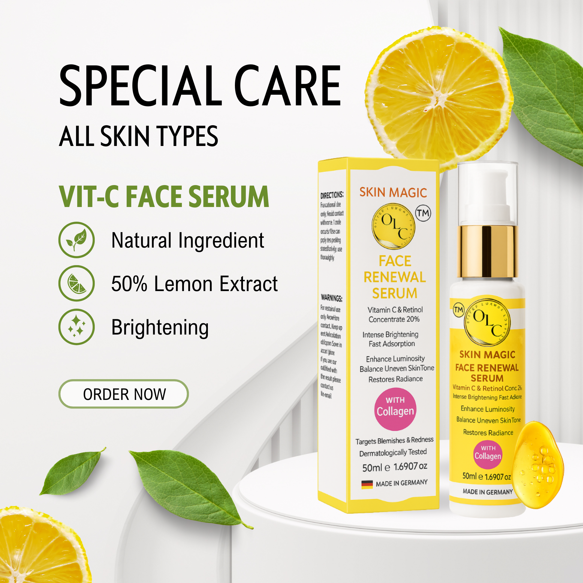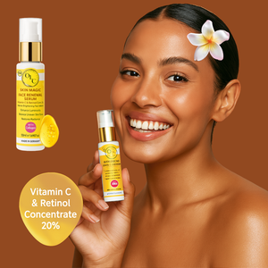 Introducing our Skin Magic Face Renewal Serum, a powerhouse formulation that combines intense brightening and collagen-boosting properties for a radiant complexion. This luxurious serum is enriched with 20% Vitamin C and Retinol, delivering fast absorption to provide exceptional results. Each carefully selected ingredient works in harmony to fade dark spots, improve skin texture, and promote a youthful glow.